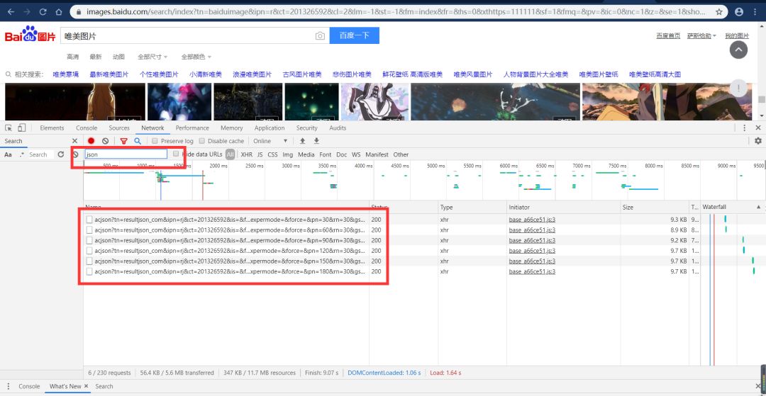 进入搜索结果之后,打开开发者模式,我发现这里面的图片数据全部都是动态加载的,这个时候就不能用平常的获取网页结构的方式来获取我们需要的数据了。这个时候我在过滤栏输入json,看一下是不是有相应的json数据传输。