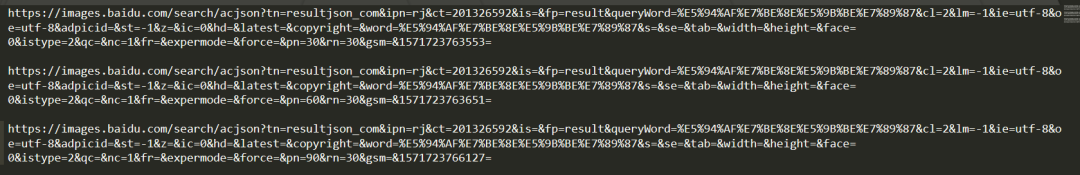 那接下来我们就来分析下这个请求json数据的链接的规律,我选取三个json数据的链接,将他们放在一起比对,我们发现只有几个参数不同,其它的都相同,不同的几个参数是pn和gsm而rn都是30,而且gsm都是13位长度的数字,根据爬虫老司机的经验,gsm表示的是当前的时间,只不过这里用了毫秒表示,然后pn表示的是这个json数据里最后一张图片的索引信息,rn表示的是每一个json数据里代有图片信息的条数。
