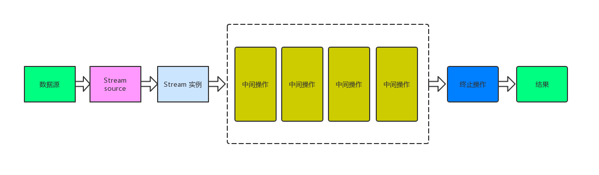 从上面的图我们可以看出,一个完成的流操作过程是包含两种类型的,一个是中间操作,一个是终止操作。中间操作指的是过滤,排序和映射等中间处理过程的方法,终止操作指的是我们将流处理完毕后返回结果的操作,比如 collect,reduce 和 count 等等。