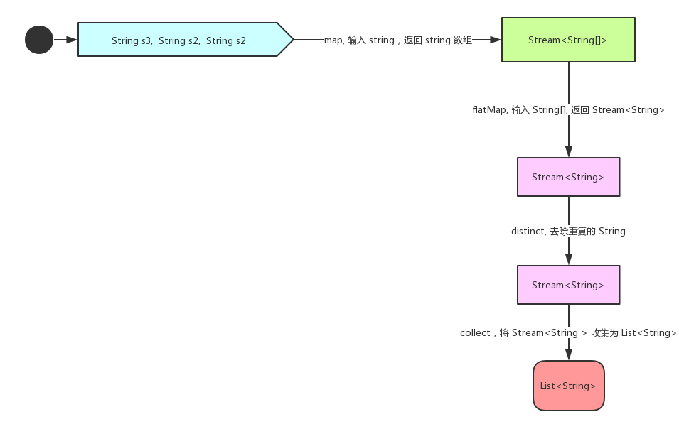 //正确的写法,要用 flatmap 将 String[] 打散成 String List<String> result = list.stream().map(item->item.split(" ")).flatMap(Arrays::stream).distinct().collect(Collectors.toList());