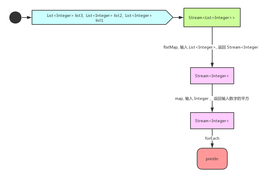 Stream<List<Integer>> stream = Stream.of(Arrays.asList(1),ArrayList.asList(2,3), ArrayList.asList(4,5,6)); // 将 stream 里面的每一个 list 再次转化为 stream<Integer>,然后在进行 map 操作。 stream.flatMap(theList->theList.stream()).map(item->item*item).forEach(System.out::println);这个例子中,List<Integer> 代表打散之前的元素,Integer 代表我们打散之后的元素类型。