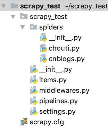 New Scrapy project 'scrapy_test', using template directory '/Library/Frameworks/Python.framework/Versions/3.6/lib/python3.6/site-packages/scrapy/templates/project', created in: