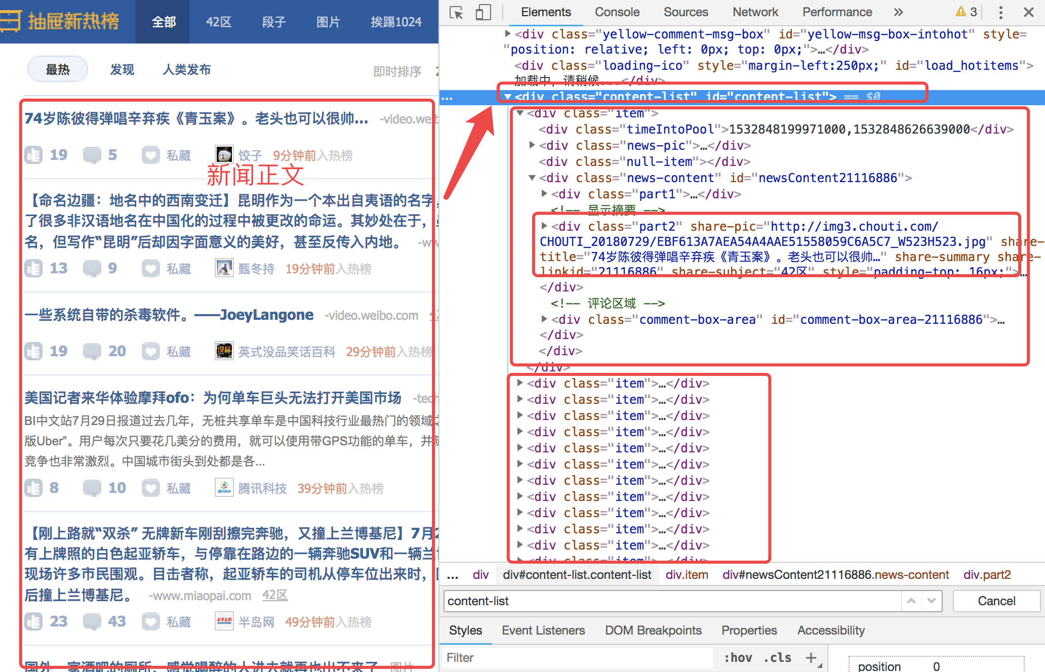 如上,需要在抽屉网中抓去热榜的所有标题,图中的框已经标好,从content-list入手,抓取每一个item中class为part2的share-title
