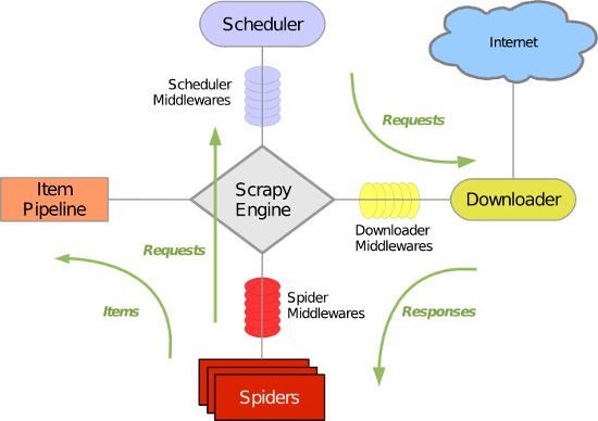 Scrapy 使用了 Twisted异步网络库来处理网络通讯。整体架构大致如下
