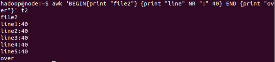 awk 'BEGIN{print "file t2"} {print "line" NR ":" $0} END {print "over"}' t2