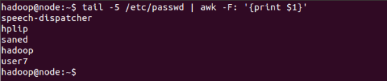 ④tail -5 /etc/passwd | awk -F: '{print $1}'