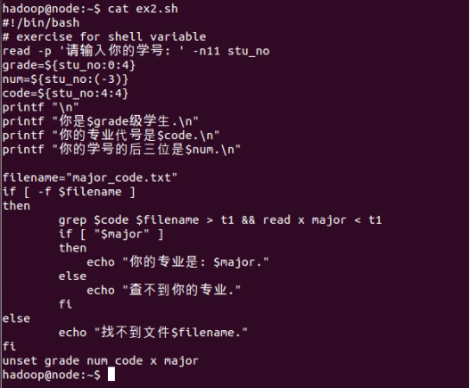若提示“找不到文件major_code.txt”,请将公邮实验文件夹中的major_code.txt拷贝至ex1.sh所在目录,重新执行一次。