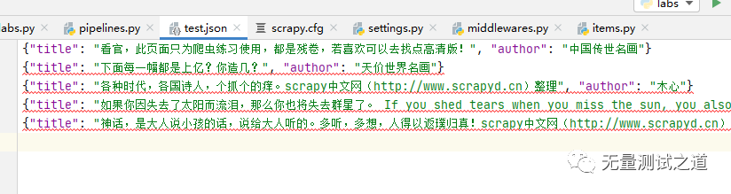 from itemadapter import ItemAdapterimport jsonclass FilePipeline(object):def open_spider(self, spider):print("当爬虫执行开始的时候回调:open_spider")def __init__(self):print("创建爬虫数据存储文件")self.file = open('test.json',"w", encoding="utf-8")def process_item(self, item, spider):print("开始处理每一条提取出来的数据")content = json.dumps(dict(item),ensure_ascii=False)+"\n"self.file.write(content)return itemdef close_spider(self, spider):print("当爬虫执行结束的时候回调:close_spider")self.file.close()这里是自定义的一个pipeline,所以还需要在setting.py 文件里面把它配置上,如下:ITEM_PIPELINES = {'lab.pipelines.FilePipeline': 300,}