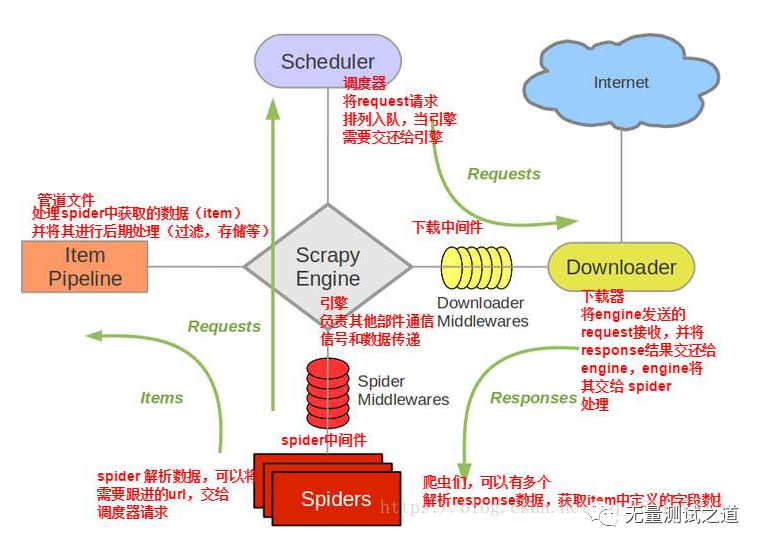 下图是从网络上找的一张Scrapy的工作流程图,并且标注了相应的中文说明信息: