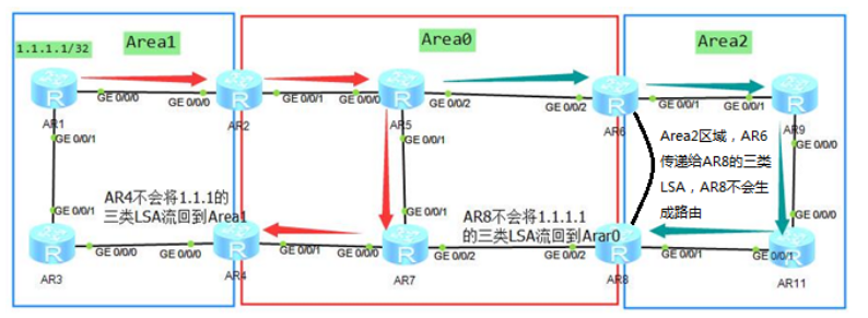 ② Area0将三类LSA传递Area2,Area2将三类LSA传递给Area3,Area3会将三类LSA重新传回给Area0,如果此时Area1中的网段消失了,Area1会删除此三类LSA,此时Area0会选择Area3传递的关于10.1.1.0/24的网段的LSA,形成环路