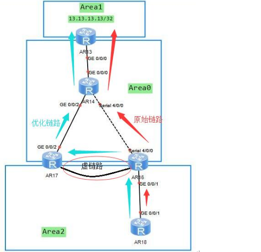 回方向:AR1和AR3没有形成邻居关系,所以AR1不会将AR4的一类和二类LSA传给AR3;由于AR3为ABR,连接AR1的链路没有形成OSPF邻居关系,所以他会接受普通区域传递过来的三类LSA,AR4生成的三类LSA会被AR3放入路由表,此时AR3访问AR4走区域1