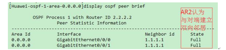 - AR2会从G0/0/0和G0/0/1端口收到两份都是Router-ID标识为1.1.1.1的hello报文