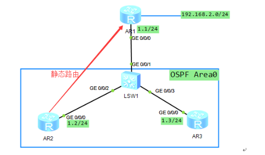 去方向:AR1将192.168.2.0的一类和二类LSA传递给AR2,AR2将此LSA传递AR4,AR4访问192.168.2.2将数据包送给AR2,AR2送给AR1,AR1发现为直连网段,交给AR3