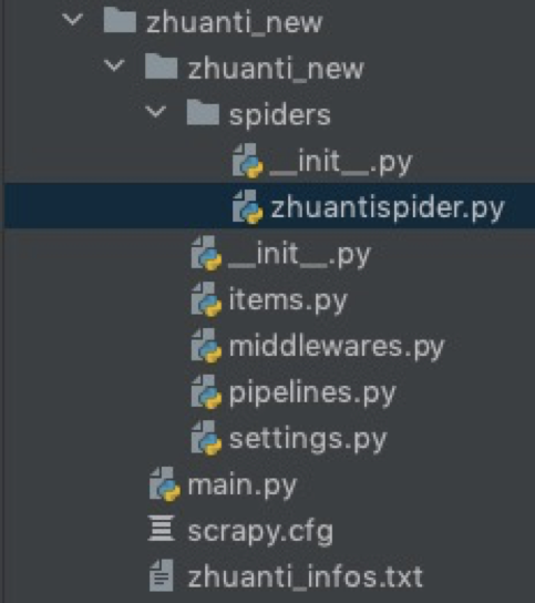 (1)最顶层的zhuanti_new文件夹是Scrapy的项目名称
