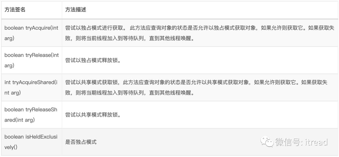 AQS使用了模板方法,把同步队列都封装起来了,同时提供了以下五个未实现的方法,用于子类的重写: