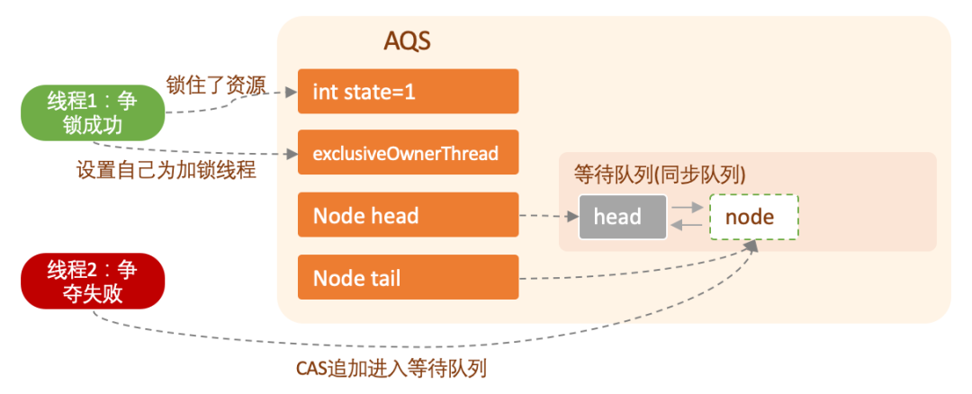 state:所有线程通过通过CAS尝试给state设值,当state>0时表示被线程占用;同一个线程多次获取state,会叠加state的值,从而实现了可重入;exclusiveOwnerThread:在独占模式下该属性会用到,当线程尝试以独占模式成功给state设值,该线程会把自己设置到exclusiveOwnerThread变量中,表明当前的state被当前线程独占了;等待队列(同步队列):等待队列中存放了所有争夺state失败的线程,是一个双向链表结构。state被某一个线程占用之后,其他线程会进入等待队列;一旦state被释放(state=0),则释放state的线程会唤醒等待队列中的线程继续尝试cas设值state;head:指向等待队列的头节点,延迟初始化,除了初始化之外,只能通过setHead方法进行修改;tail:指向等待队列的队尾,延迟初始化,只能通过enq方法修改tail,该方法主要是往队列后面添加等待节点。