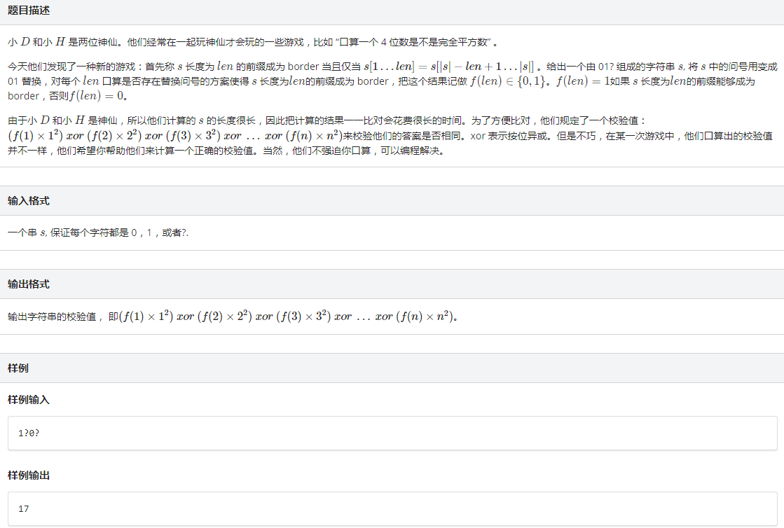 由于一个1和0 位移差的绝对值的 所以约数的位移差 的border 都不可行,所以正着的[ s[i] == '1' ] 和 倒着的 [ s[i] == '0' ] 卷一下,就可以判断哪些位移是可行的(不考虑被倍数覆盖的),然后再一个调和级数考虑倍数覆盖就好啦。。。