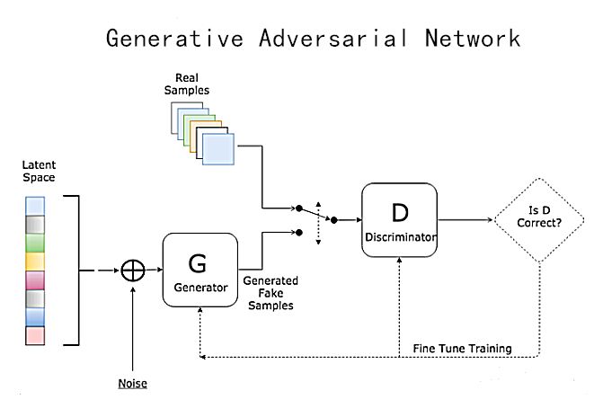 对抗性生成网络(GenerativeAdversarial Network),由 Ian Goodfellow 首先提出,由两个网络组成,分别是generator网络(用于生成)和discriminator网络(用于判别)。GAN网络的目的就是使其自己生成一副图片,比如说经过对一系列猫的图片的学习,generator网络可以自己“绘制”出一张猫的图片,且尽量真实。discriminator网络则是用来进行判断的,将一张真实的图片和一张由generator网络生成的照片同时交给discriminator网络,不断训练discriminator网络,使其可以准确将discriminator网络生成的“假图片”找出来。就这样,generator网络不断改进使其可以骗过discriminator网络,而discriminator网络不断改进使其可以更准确找到“假图片”,这种相互促进相互对抗的关系,就叫做对抗网络。图一中展示了GAN模型的结构。