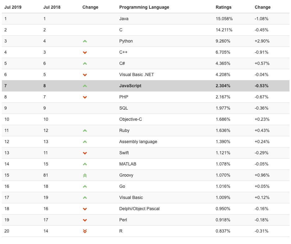 另外, 7 月排名前十的分别是:Java, C, Python, C++, C#, Visual Basic .NET, JavaScript, PHP, SQL 和汇编语言。和上个月的不同之处主要是 C# 以微弱的优势超过了 Visual Basic .NET 的排名,再次进入 TOP 5,而宇宙语言 PHP 下滑到第八位。