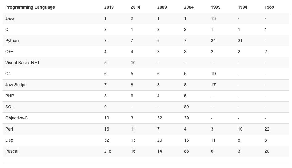 各大编程语言的历史排名(1988-2019)