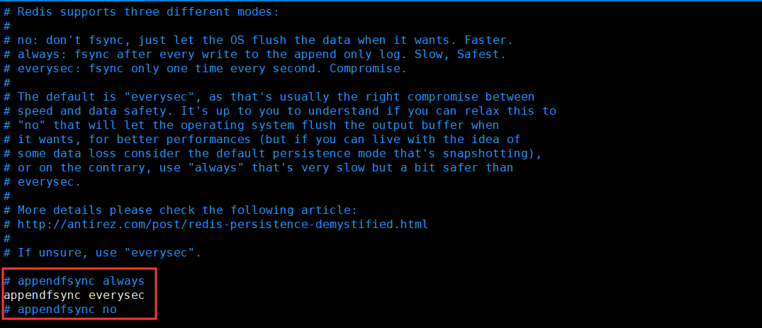 推荐(并且也是默认)的措施为每秒fsync一次,这种fsync策略可以兼顾速度和安全性。配置文件如下: