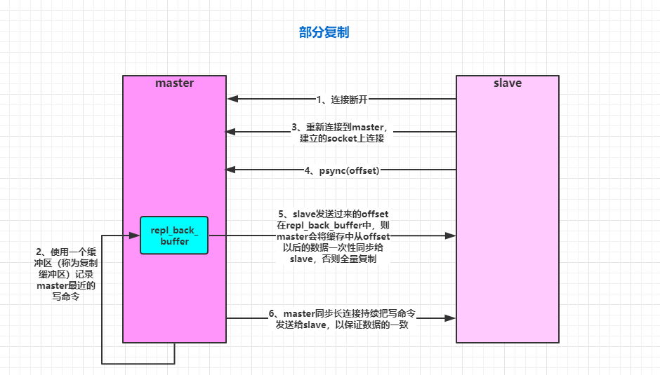 ⑤ slave发送过来的offset在repl_back_buffer中,则master会将缓存中从offset以后的数据一次性同步给slave,否则全量复制