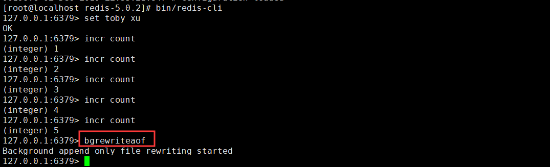 (1)AOF文件里可能有太多没用指令,所以AOF会定期根据内存的最新数据生成新的aof文件,当然可以手工执行bgrewriteaof命令也能重写AOF,比如执行如下命令: