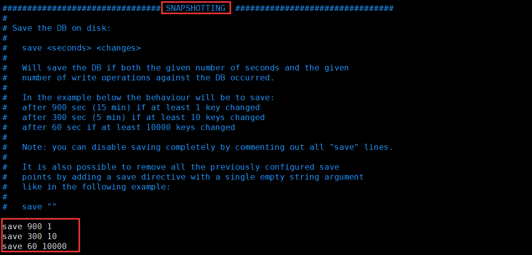 RDB是Redis Database缩写,在默认情况下,Redis将内存数据库快照保存在名字为dump.rdb的二进制文件中。可以对Redis进行设置,让它在“ N秒内至少有M个键值改动”这一条件被满足时,自动保存一次数据。比如下图,900秒内有1个键值或者300秒内有10个键值或者60秒内有10000个键值改动,自动保存一次数据;关闭RDB只需要将所有的save保存策略注释掉即可。