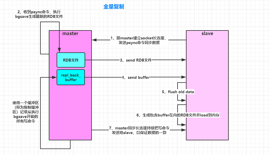 将主节点中的所有数据都发送给从节点,是一个非常重型的操作,当数据量较大时,会对主从节点和网络造成很大的开销。全量复制流程图如下: