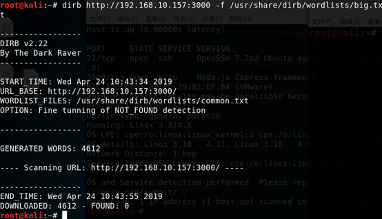1.dirb http://192.168.10.157:3000 -f /usr/share/dirb/wordlists/big.txt