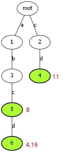 然后绿色的是终止节点(多个终止就开个vector),然后我们把其他串拿进来匹配后,每碰到一个绿色点,我们就让$C[pos-End[p][i]]$加1,其中pos是当前匹配位置(匹配串),p是AC自动机中位置,End[p]就是vector,这样处理完后,我们再次扫一遍匹配,看一下哪个位置的$C[i]$与段数相等,那么它就可以作为这段模板串的匹配起点