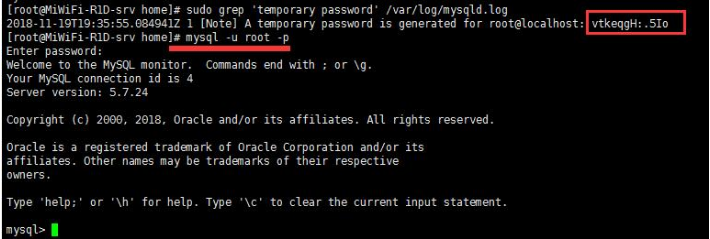 MySQL在启动的时候,就已经自动进行了初始化。下面我们可以通过这个命令来查看超级用户的密码,这个存放在MySQL日志里: