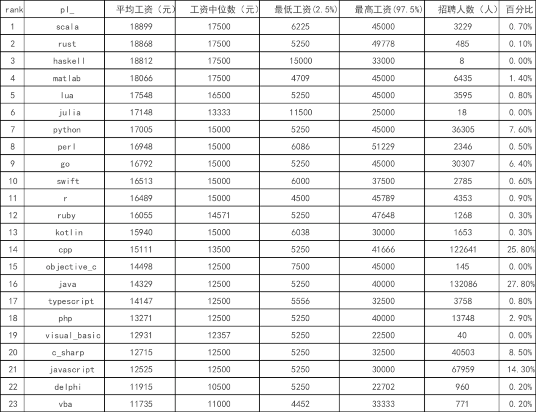 工资最高的前6名都是小众语言,因为用的人少工资相对也高,python排在第7的位置。远高于java、php等语言的工资