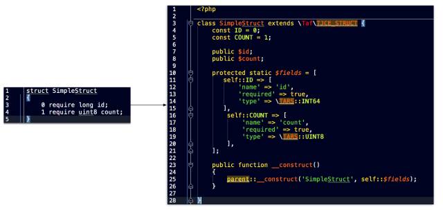 如果要设计这个扩展,必须要将上文中Tars的数据结构通过C语言的方式加以表达,同时设计出基于这套数据结构的编码器与解码器。另一个需要考虑的方面是,必须要使得在PHP层面尽可能的简单、易用,这就对扩展的设计提出了比较高的挑战。一方面要兼顾性能,另一方面,要将Tars协议中的struct,进行了PHP中的Class的表达:
