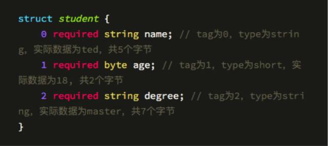 从注释中可以看到,三个字段需要的字节数为14,再加上结构体的开始和结构体结束的标识共2个字节,一共只需要16个字节而已。相比之下,这仅仅是JSON的1/4,是XML协议标识同样信息的1/5,高下立判. 巧妙地用协议强约定换传输可读性,这就是高信息熵的二进制协议的诀窍。