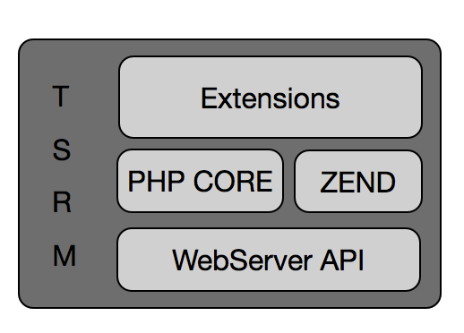 最底层的Server API用来PHP与Webserver通信,这个主要是之前与APACHE配合需要使用的。在其左上的PHPCORE层,是为了提供最基本的文件和网络操作的能力。而右上的ZEND,则是用来把PHP的脚本语言编译成机器码的工具。最上面就是扩展层了,这层会充分利用ZEND的API和PHPCORE的能力,直接写出ZEND能够高效执行和理解的代码,省去了PHP脚本编译为机器码的过程,从而大大的提高执行的效率。