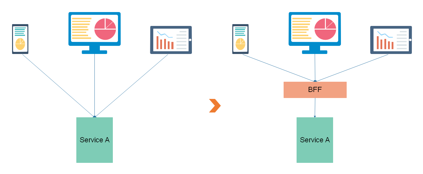 手机、平板端、PC机等用户终端都需要向每个Service,例如Service A发送请求。对于同一个功能,不同的终端需要的数据格式和内容会有不同。此时 Service A 的一个接口,不能同时满足三个客户端的不同需求。我们可以在Service A中开发三个接口,也可以增加一个数据裁剪服务,将数据按照不同终端的不同要求进行裁剪,这个服务层叫做BFF。