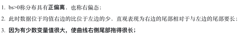 偏度(skewness):也称为偏态,是统计数据分布偏斜方向和程度的度量,是统计数据分布非对称程度的数字特征。直观看来就是密度函数曲线尾部的相对长度。偏度刻画的是分布函数(数据)的对称性。关于均值对称的数据其偏度系数为0,右侧更分散的数据偏度系数为正,左侧更分散的数据偏度系数为负。样本偏度系数如下: