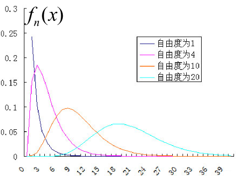 服从自由度为 的 分布, 记为 。自由度指的独立变量的个数。概率密度函数长这样: