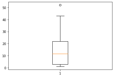 pd.Series(a).describe()## 结果:count 16.000000mean 14.750000std 15.316658min 1.00000025% 2.75000050% 11.50000075% 22.000000max 52.000000dtype: float64## 还可以借助plt画出箱型图import matplotlib.pyplot as pltplt.boxplot(pd.Series(a))