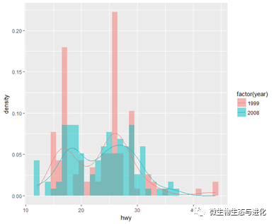 geom_histogram(position='identity', alpha=0.5,binwidth=1, aes(y=..density.., fill=factor(year))) +