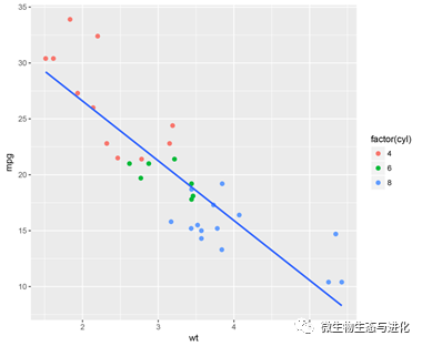我们继续根据因子cyl对数据点进行分组并添加趋势线: