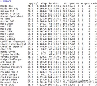在进行正式的数据分析之前,通常要对数据进行处理。而读取数据仅仅是最简单的,之后还要进行数据的筛选、排序、转换等。数据框是最方便的数据存储、管理对象。R有很多内置的示例数据集包括向量、矩阵数据框等,可以使用data()进行查看,接下来我们以R内置数据mtcars(32辆汽车在11个指标上的数据)为例进行分析,如下所示: