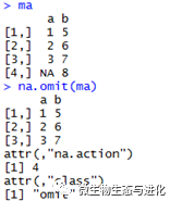 可以使用函数na.omit()来移除变量中缺失值或矩阵、数据框含有缺失值的行,如下所示: