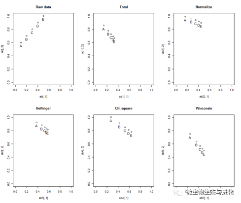 在没有处理的情况下,群落之间的欧氏距离相等,然而在生态学方面我们不这么看,因为B中物种1的数量是A的两倍,其群落差异显然比D、E更大,五种处理方法标准化数据后的结果都比较好的证实了上面的猜想,尤其是最后两种。然而在微生物生态中,我们倾向于认为微生物群落是一个整体,不同样品之间物种的相对丰度是有可比较的实际意义的,因此最常用的就是总和标准化(当然在不涉及丰度比较的聚类和排序分析中各种标准化方法都可以尝试,在传统群落研究里,虽然经常使用中心化等方法,但是需要使用盖度等对不同物种进行加权,因此直接进行总和标准化从某种意义上是使用相对丰度进行加权)。