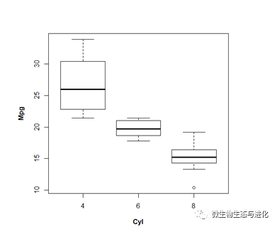 boxplot(mpg~cyl, xlab="Cyl", ylab="Mpg")