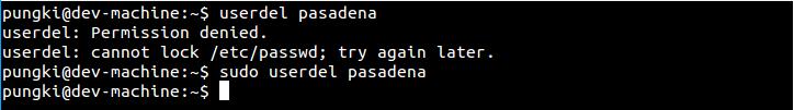 正如你所见,我们不能没有root权限而删除用户 pasadena。当我们有权限时,系统不会给出错误信息,这意味着用户已经成功删除。