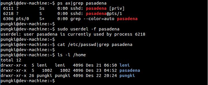 截图的上面显示用户 pasadena 已经登录了系统。它被标记的进程6218是 SSHD 进程。而当我们用“userdel -f pasadena”只会显示已经登录的要被删除的用户信息。命令本身已经成功。如果我们使用cat 命令查看/etc/passwd的内容,我们看不到到用户 pasadena 存在了。他的家目录还存在但是所有者只能显示为数字ID。
