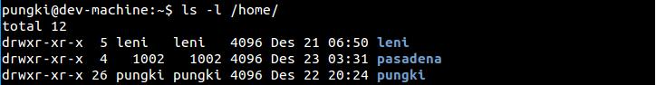 当我们进入/home目录时,我们仍旧可以看到ID 1002拥有 pasadena 文件夹。已创建的用户通常会有一个与用户名相同的组名。1002是 pasadena 用户名的 UID 和 pasadena 组名的 GID。