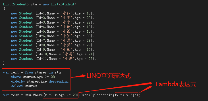 以上是对LINQ查询表达式和Lambda表达式的一个简单的应用,都是查询stu列表中年龄大于等于20岁的结果并且把结果按照年龄降序排列。